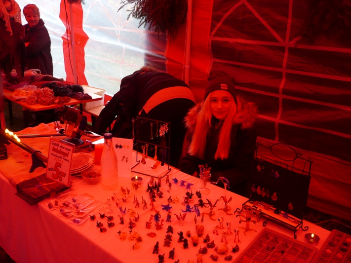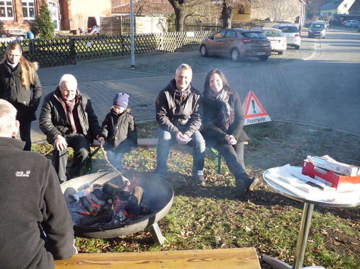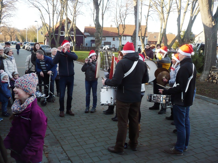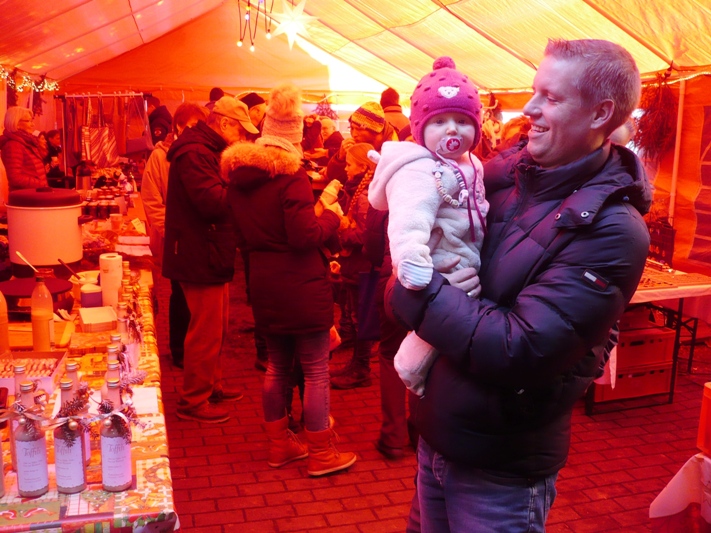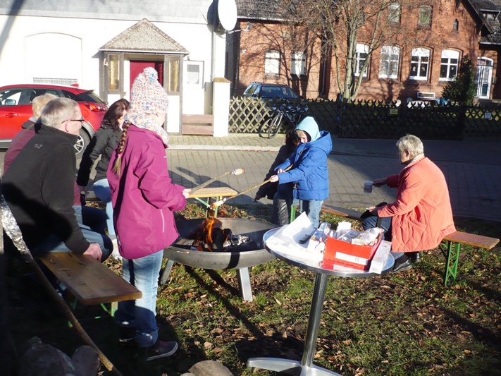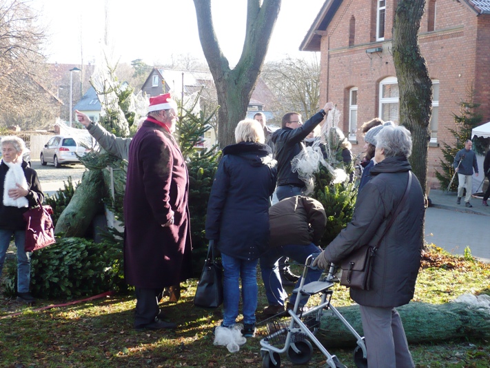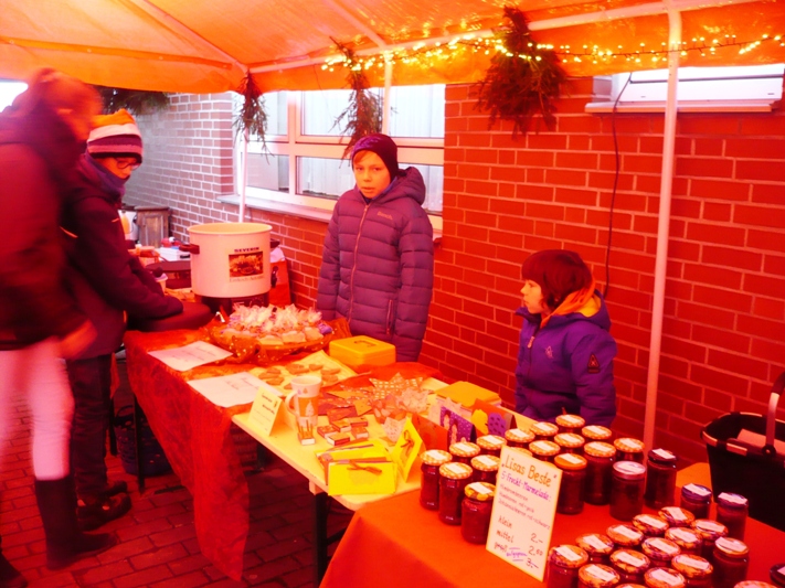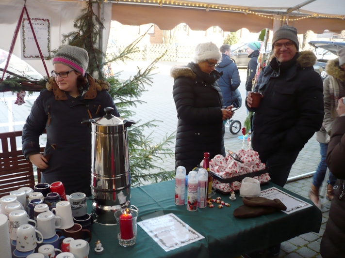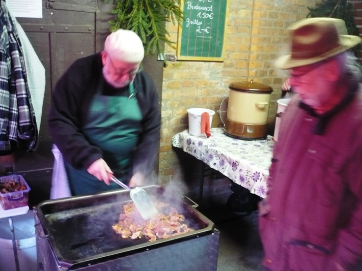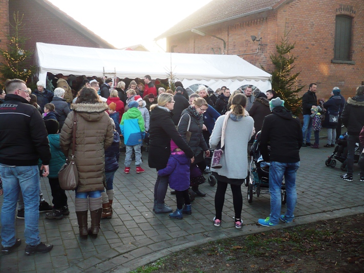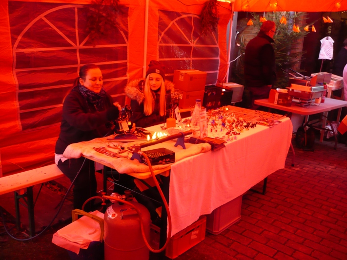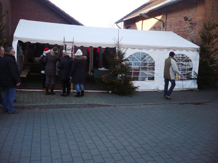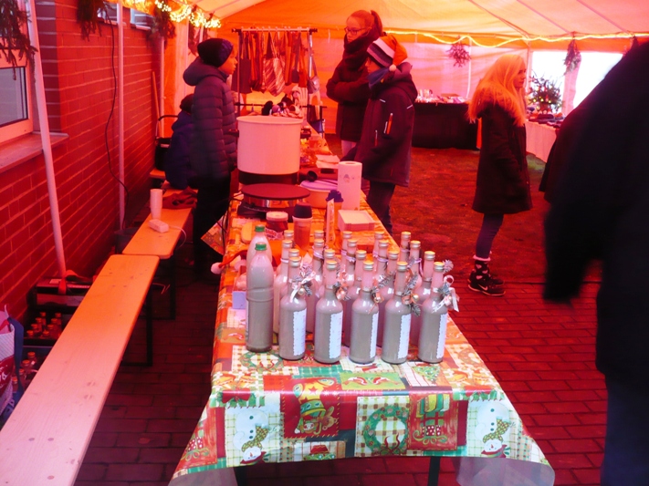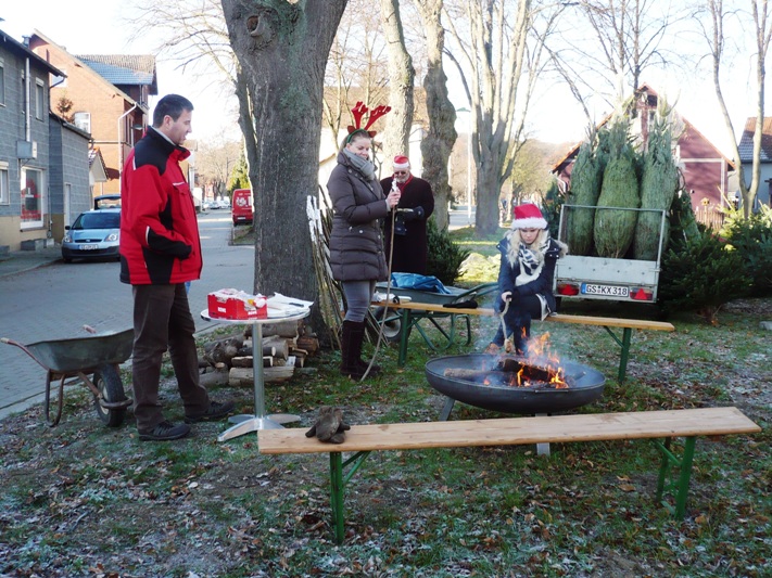 Der Wettergott spielte auch mit. Es war zwar kalt aber die Sonne zeigte sich von ihrer guten Seite. Ab 10:30 Uhr kamen die ersten Besucher, um sich in aller Ruhe schon einmal umzuschauen, denn im Laufe des Tages besuchten immer mehr Gäste den Weihnachtsmarkt, um sich an den Produkten und den vielen Leckereien zu erfreuen. Sogar Gäste aus Helmstedt und Oker ließen es sich nicht entgehen, diese Veranstaltung zu besuchen. Jung und Alt tummelte sich hier und für jeden war Etwas vorhanden. Hier eine Auswahl der Angebote: selbstgemachter Eierlikör, Crêpes, Kinderpunsch und Schoko-Crossies. Für das leibliche Wohl wurde in Form von Pommes Frites, Bratwurst, Gyros, leckerem Glühwein und anderen Getränken gesorgt. Eigenes gebranntes Porzellan wurde ausgestellt. Die Gäste konnten sich mit Wildsalami aus Harzer Wäldern versorgen. Die bekannte Wiedelaher Hausschlachtewurst wurde angeboten. Selbstgestrickte Mützen, Handschuhe und Schals für die kalte Jahreszeit. Lisa’s eigene Marmelade war auch wieder ein Renner. Der neu gegründete Spielmannzug hatte eigene Pralinen hergestellt. Selbstgebackene Kekse waren reichlich vorhanden. Der Katholische Kindergarten St. Joseph schmierte u. a. Schmalzbrote. Eine Glasbläserin zeigte ihre Kunst. Weihnachtliche Bastelleien und Gestecke standen zur Auswahl. An Eierpunsch und selbstgebrannte Mandeln konnten sich die Geschmacksnerven erfreuen. Auf der Grünfläche gegenüber wurden Nordmanntannen in verschiedenen Größen als Weihnachtsbaum angeboten, die auf Wunsch bis vor die Haustür geliefert worden sind. Daneben stand die große Feuerschale für das Stockbrotbacken. Die Kinder und Eltern hatten dabei großen Spaß, und die Kundschaft riß hier selten ab, sodaß alle Portionen restlos aufgebraucht wurden. Und manch Einer wärmte sich an dem Feuer wieder ein bisschen auf.