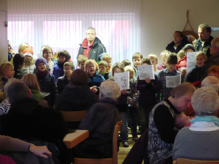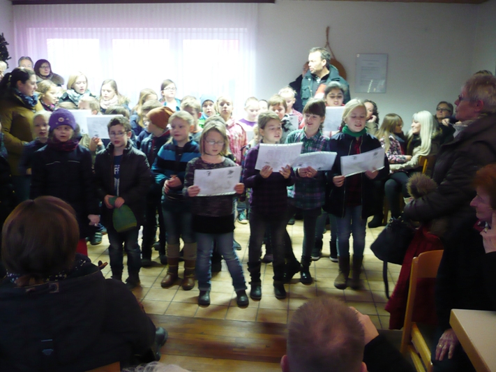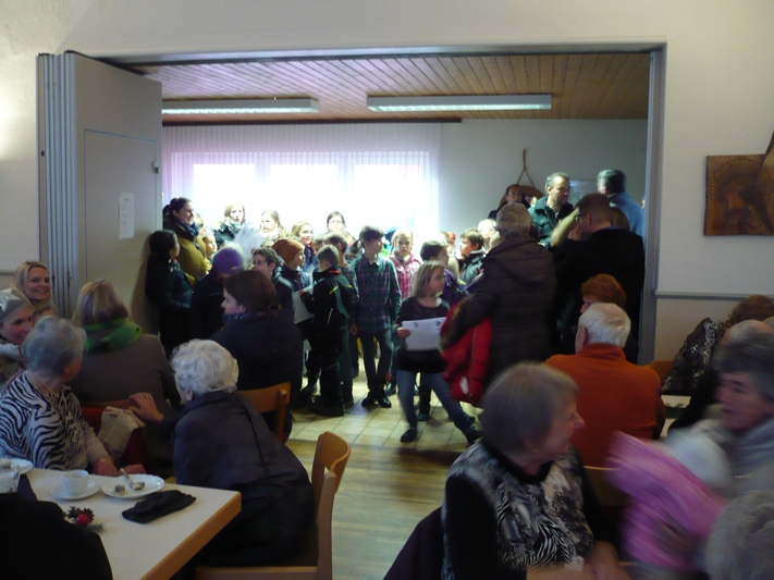 Das Pfarrheim wurde immer voller, denn jetzt folgten weitere Höhepunkte im Programm. Zuerst zeigten die Kinder des Kindergartens St. Joseph unter Leitung von Frau Härtel und Frau Pressel ihr weihnachtliches Programm. Die „Kiddys“ sangen aus voller Brust einige altbekannte Weihnachtslieder und animierten die Zuhörer zum Mitsingen. Der Vortrag dauerte ca. eine Viertelstunde und unter großem Beifall verließen sie dann die Bühne. Nach einer kleinen Pause hatten die Schüler von der ersten bis vierten Klasse sowie ehemalige Schüler der vierten Klasse unter Leitung von Rektor Simon und dem Musliklehrer ihren großen Auftritt. Sie schmückten ihre weihnachtlichen Liedvorträge mit mehreren Gedichten und auch hier stimmten die Gäste in die Lieder mit ein. Zum Abschluß führten sie draußen noch einen gut einstudierten Tanz auf, da sie wegen des prall gefüllten Pfarrheimes drinnen keinen Platz dafür hatten. Auch diese Gruppe erhielt einen donnernden Applaus.