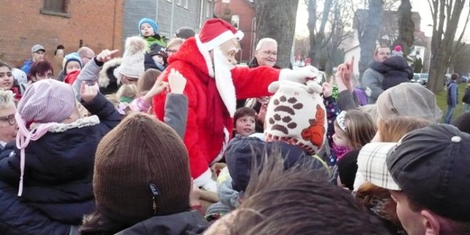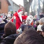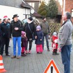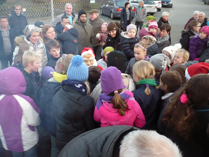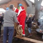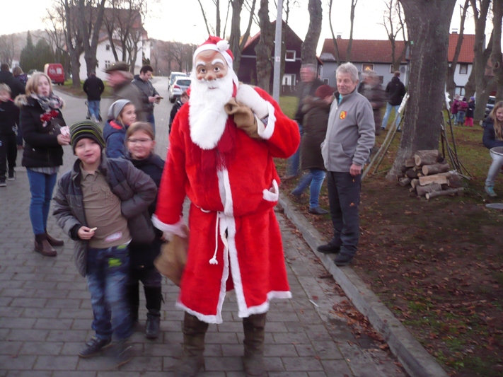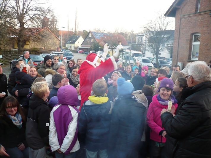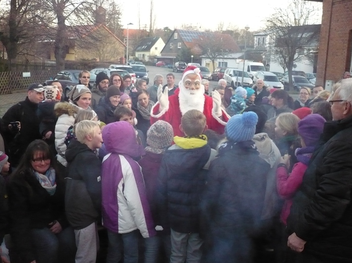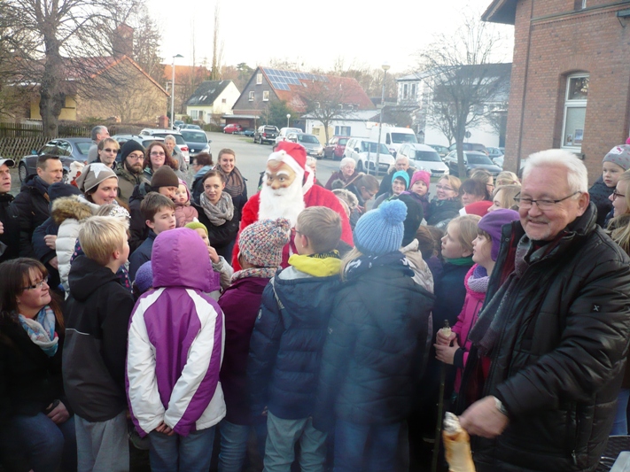 Im Anschluß daran wartete dann die große Belohnung auf alle anwesenden Kinder. Der Nikolaus kam aus dem Finkenherd herbeigeeilt, um seine Geschenke zu verteilen. Bei den kleineren Kinder sah man zuerst doch manch ängstlichen Blick. Als der Nikolaus sich mit den Kleinen aber freundlich unterhielt und die weihnachtlichen Gaben aus dem Sack hervorholte, kam doch ein freundliches Lächeln zustande. Einige von den Kindern konnten sogar ein Gedicht aufsagen, was den Nikolaus sehr erfreute. Als Abschluß stimmten alle Zuschauer gemeinsam in ein fröhliches Weihnachtslied ein.