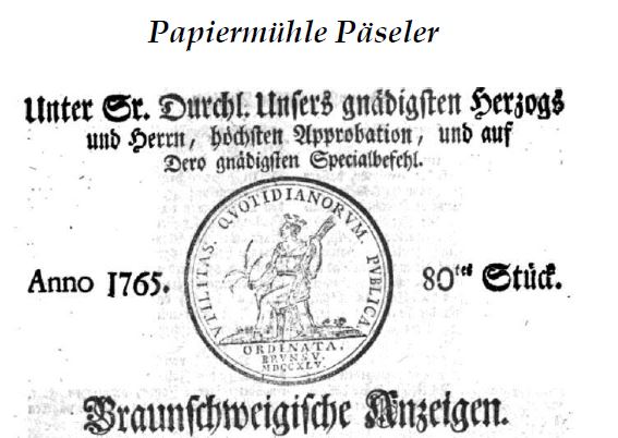 Am 08. März 1756 wird dem Papiermüller G.A. Päseler vom Hildesheimer Dom-Capitular die Genehmigung erteilt, eine Papiermühle zu erbauen: