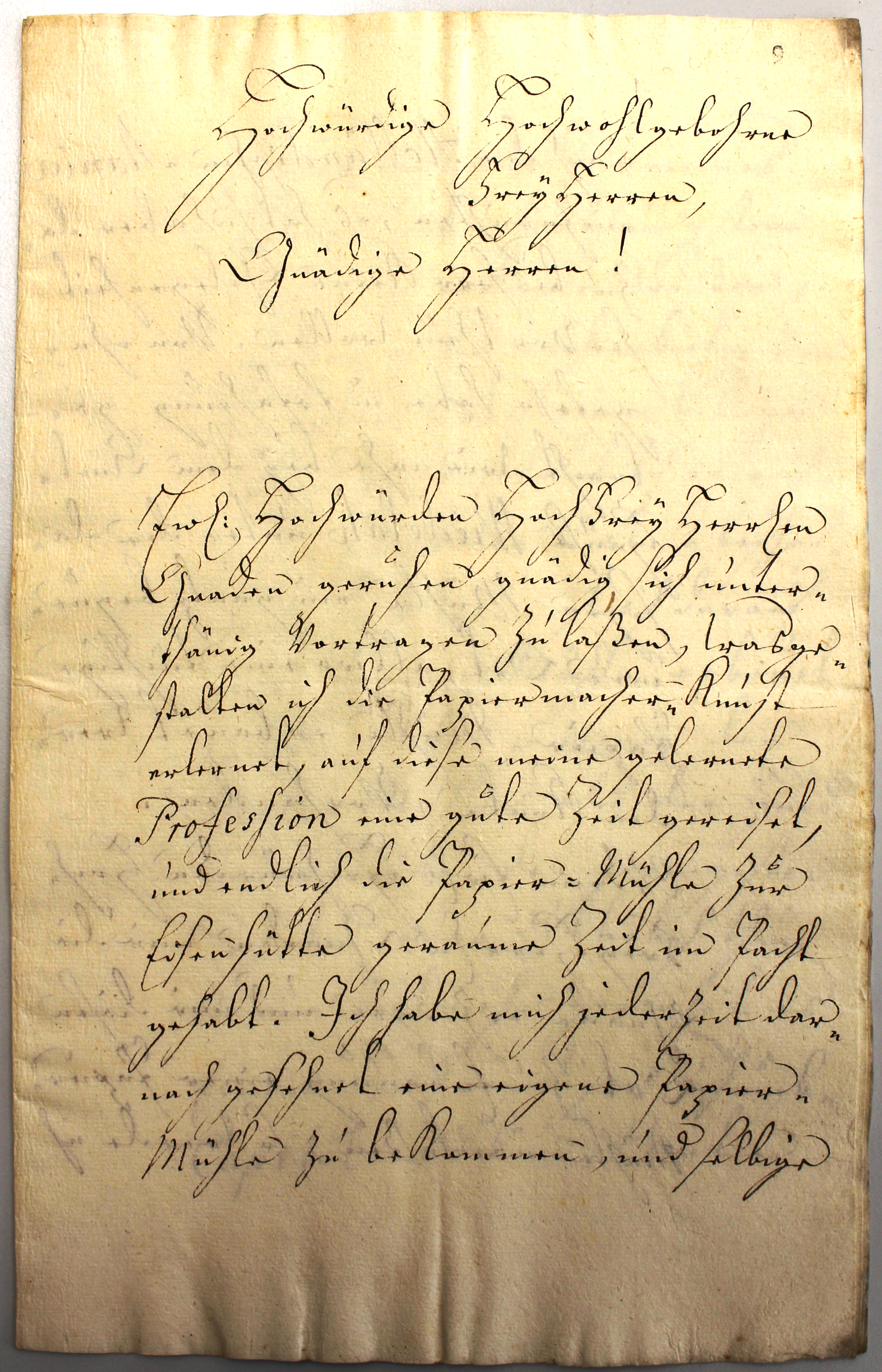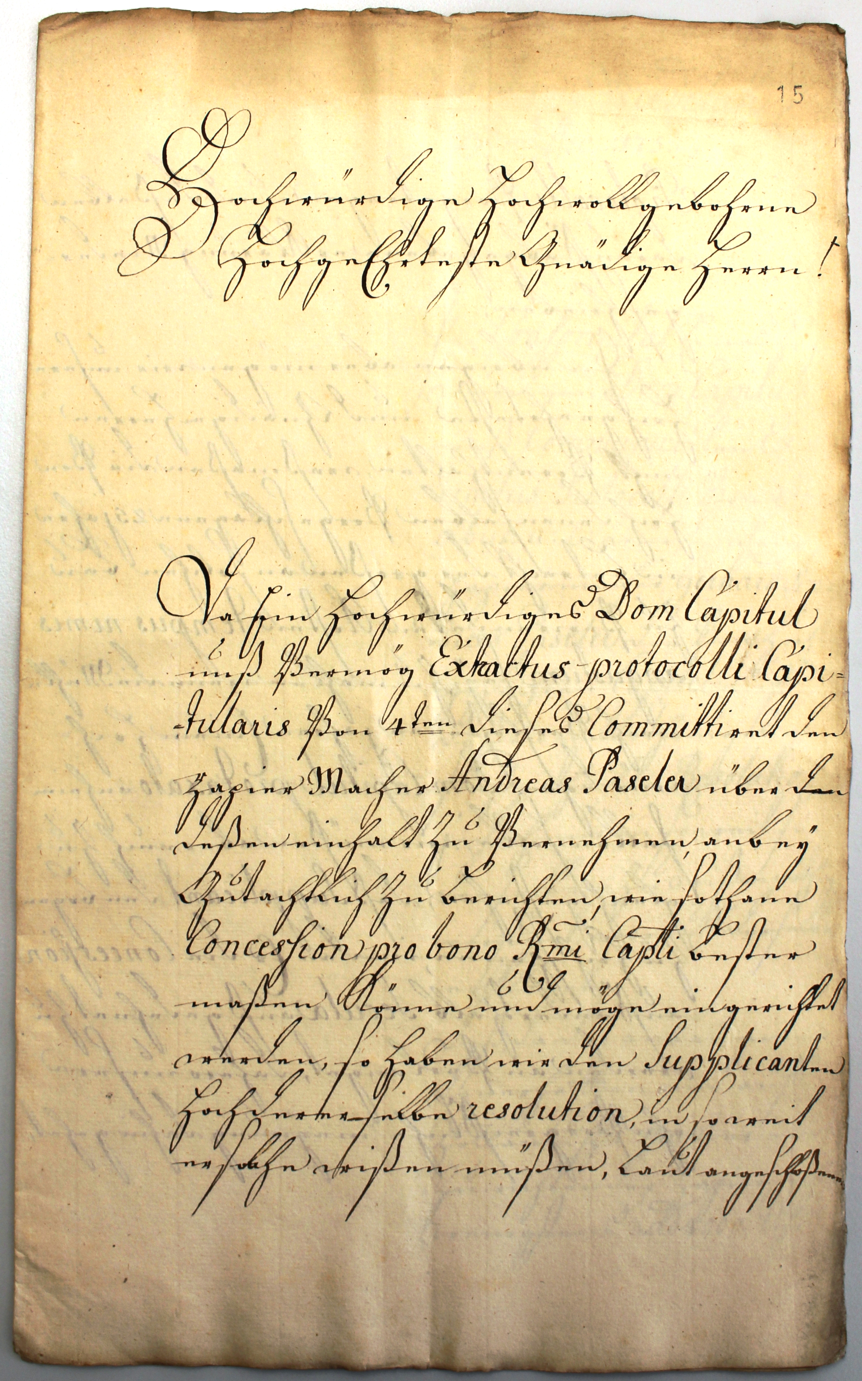 Da ein Hochwürdiges Dom Capitul Exhactus protocolli Capitularis von 4. dieses Commitient den papiermacher Andreas Päseler den dessen Einhalt zu vernehmen, anbei gutachtlich zu berichten wie fortan Concession pro bono (für eine gute) Rmt Capti bestermaßen könne und möge eingerichtet werden, so haben wir den Supplicanten (Bittsteller) Hochderenselben resolution in soweit solche wissen müssen. Laut angeschlossenem Protocolli vorgetragen und desselben darauf abgegebenen Erklärung niedergeschrieben;