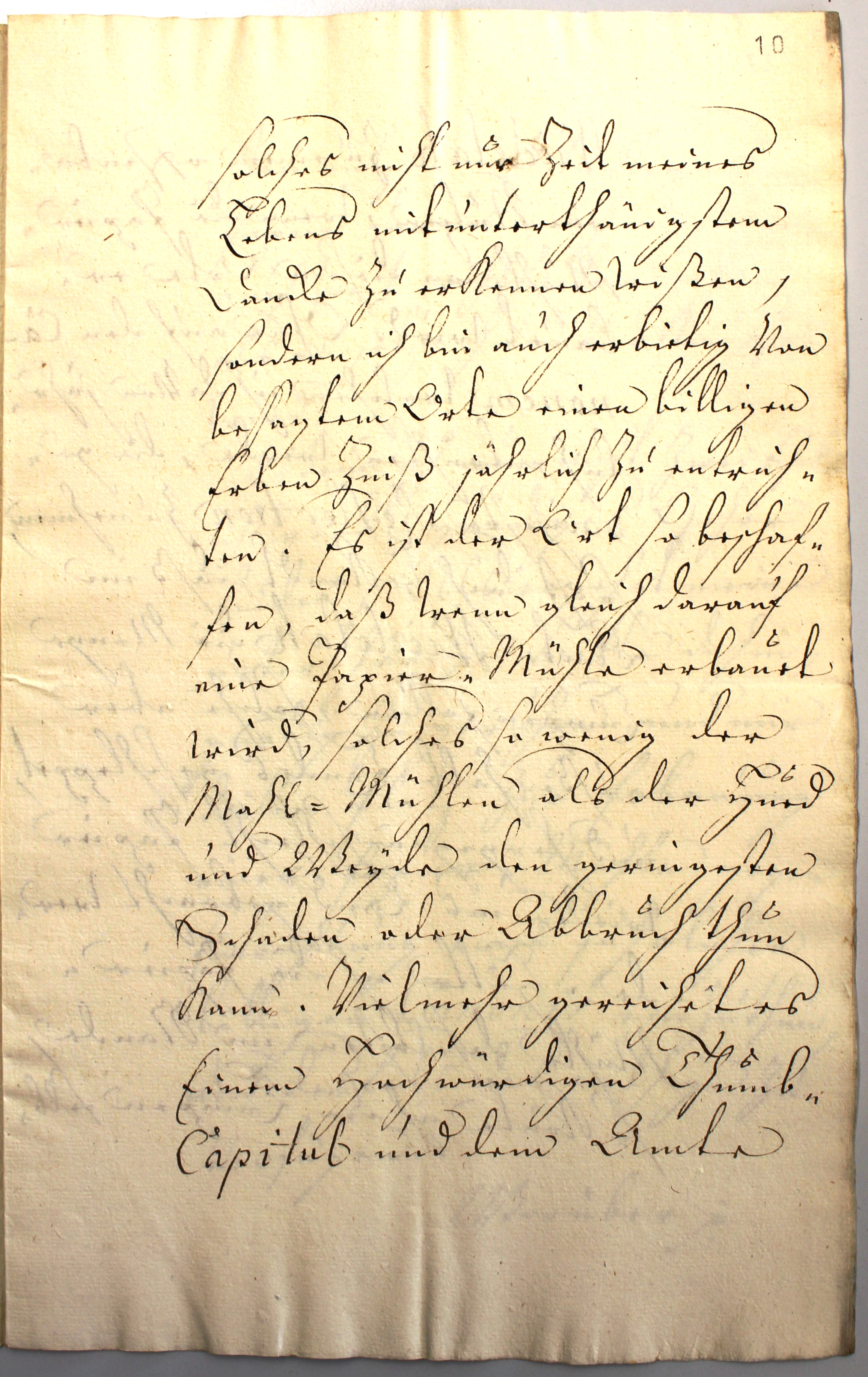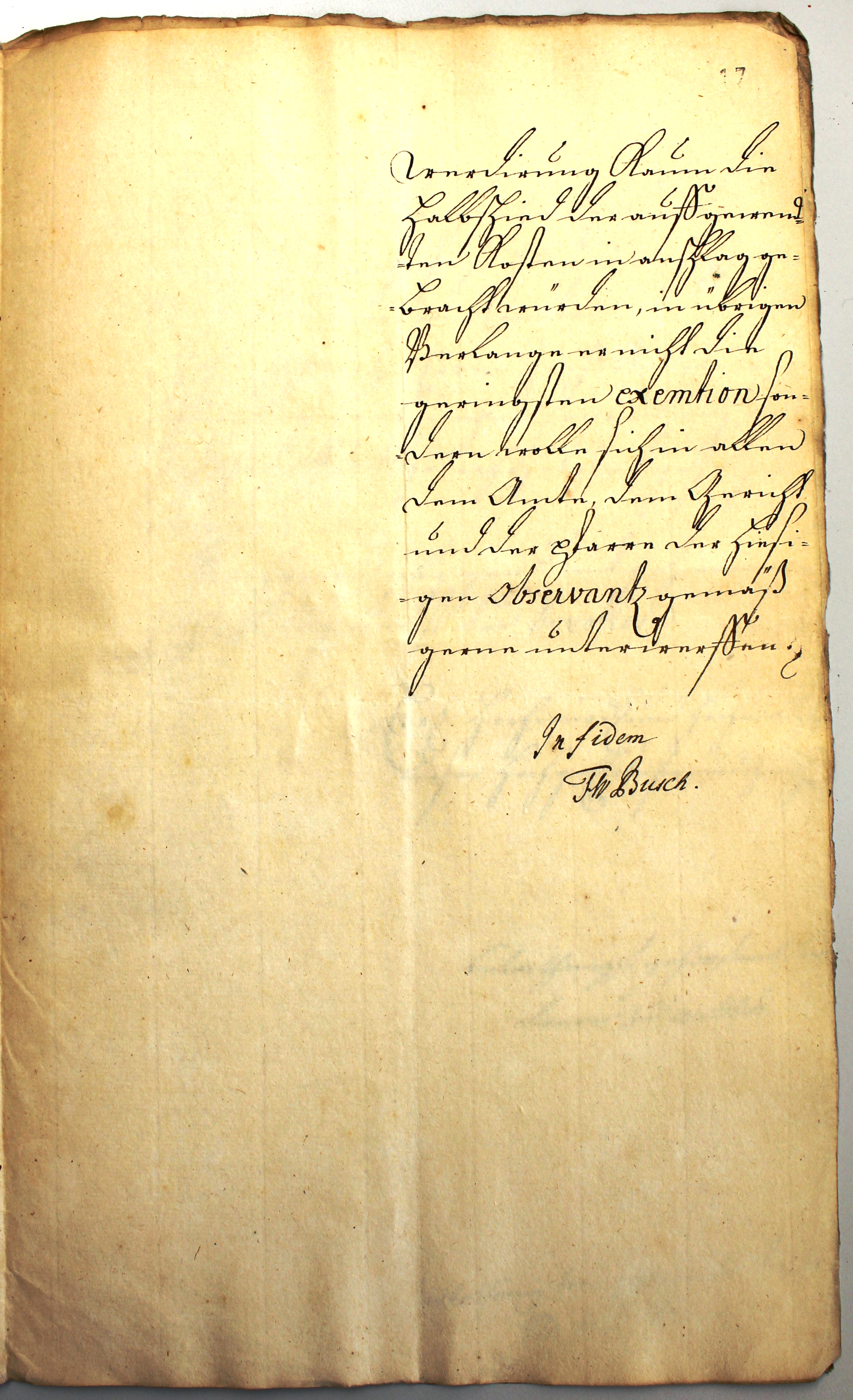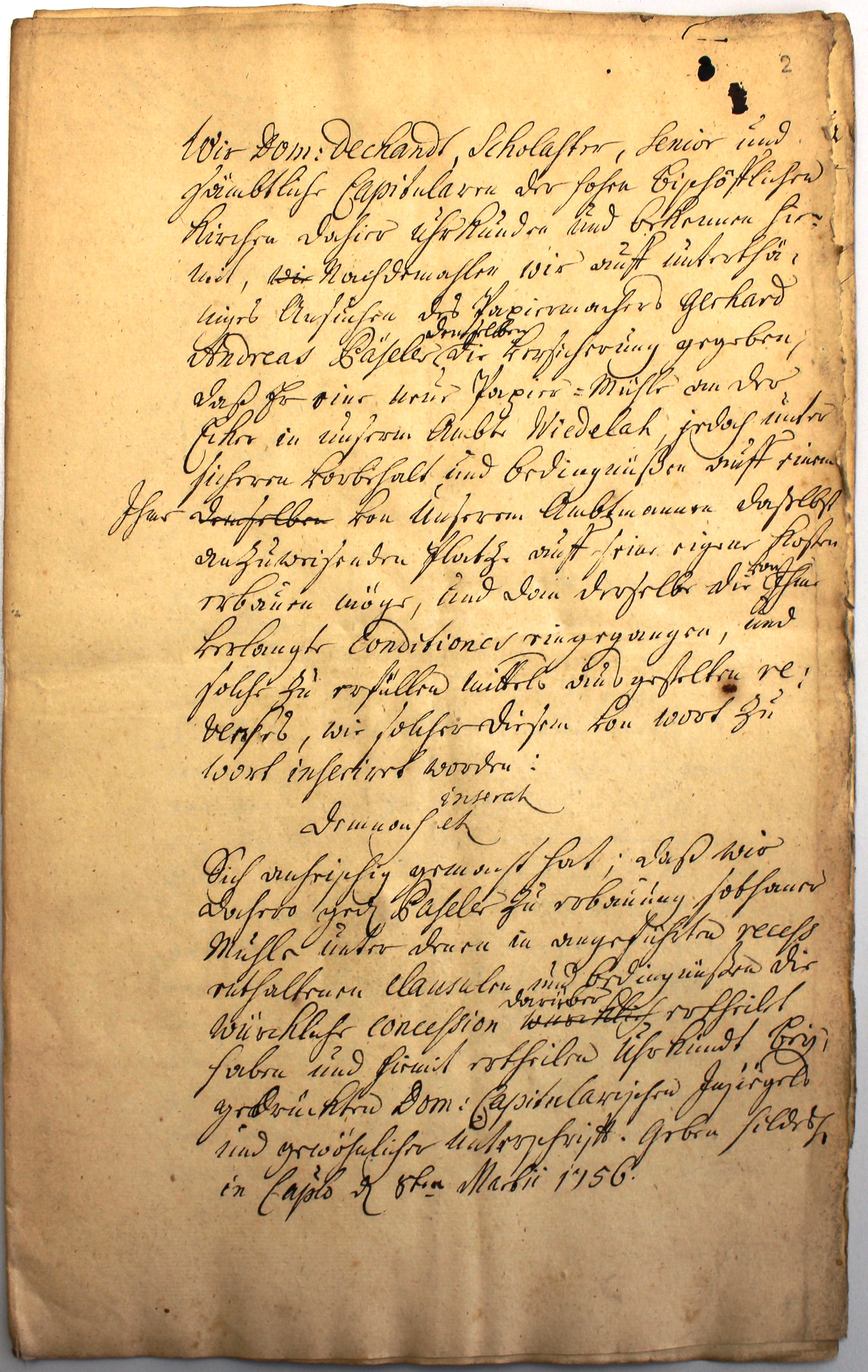 Sich anheischig gemacht hat, dass wir dahero Gerh. Päseler zu Verbauung lobsamer Mühle unter deren in angeführtem receß (Gebrauch ?) enthaltenen Clausalen und Bedingnüssen der wirklichen concession darüber erteilt haben und hiermit erteilen Urkund bei gedrucktem Dom : Capitularischen Papier(geld) und gewöhnlicher Unterschrift.
