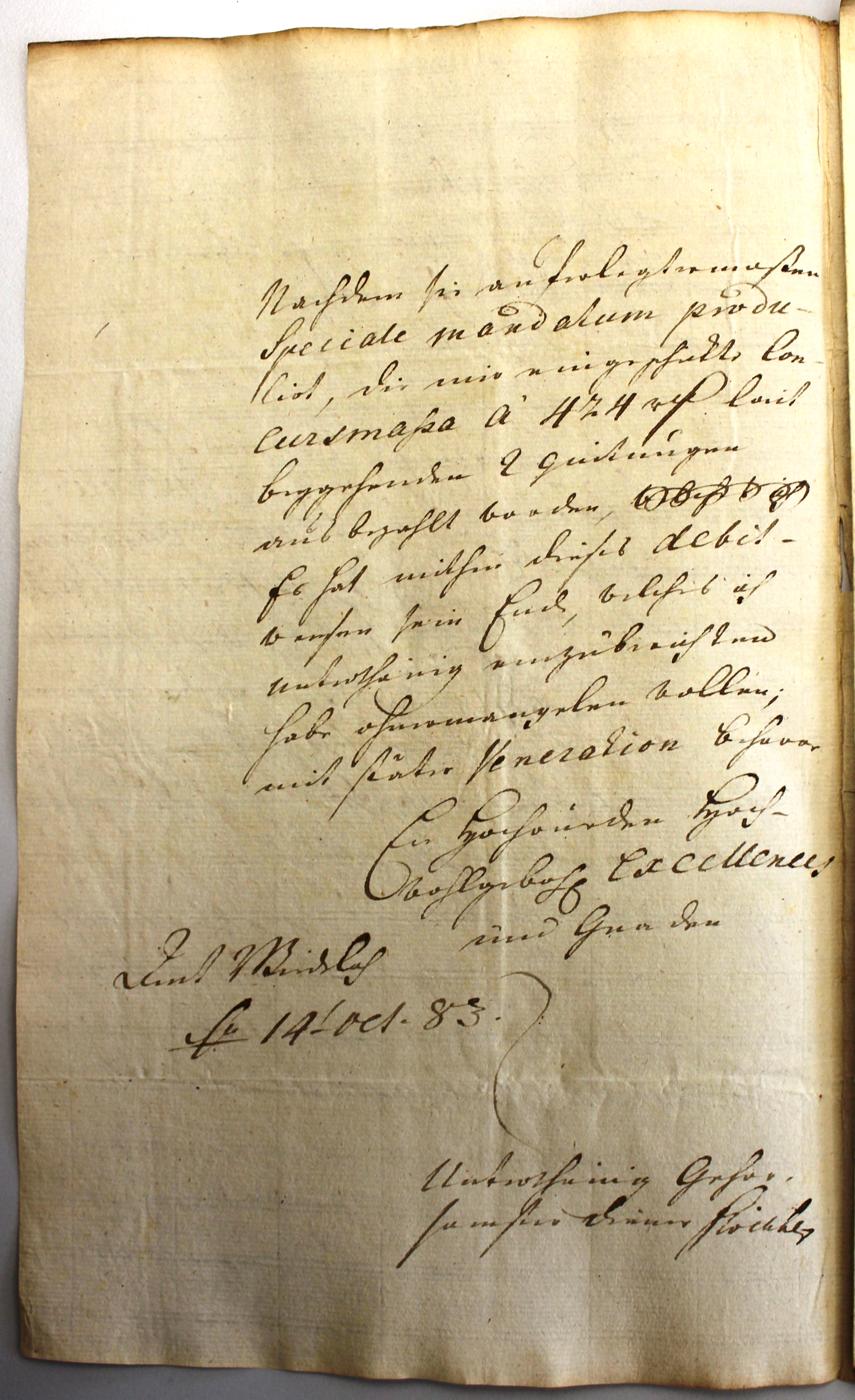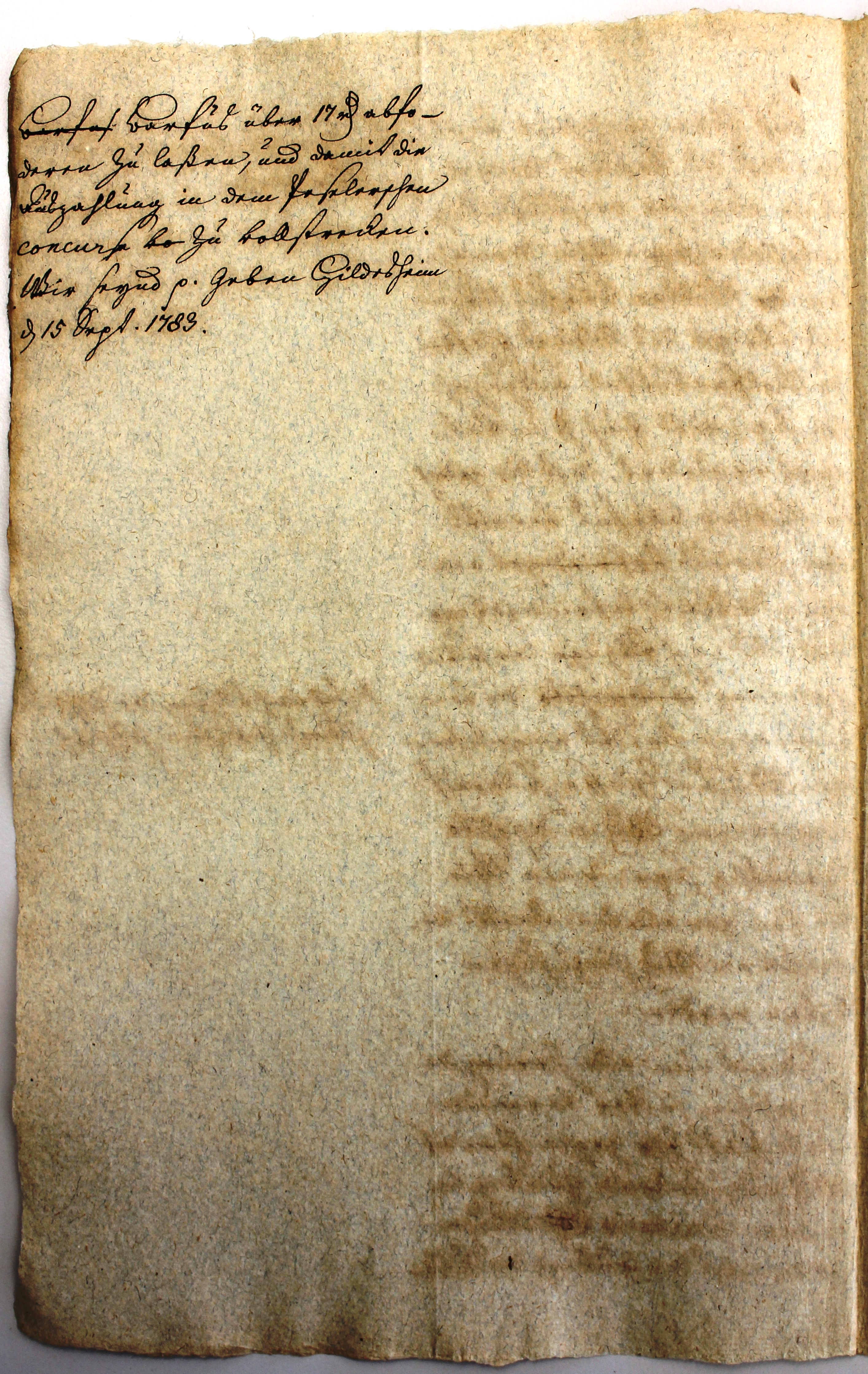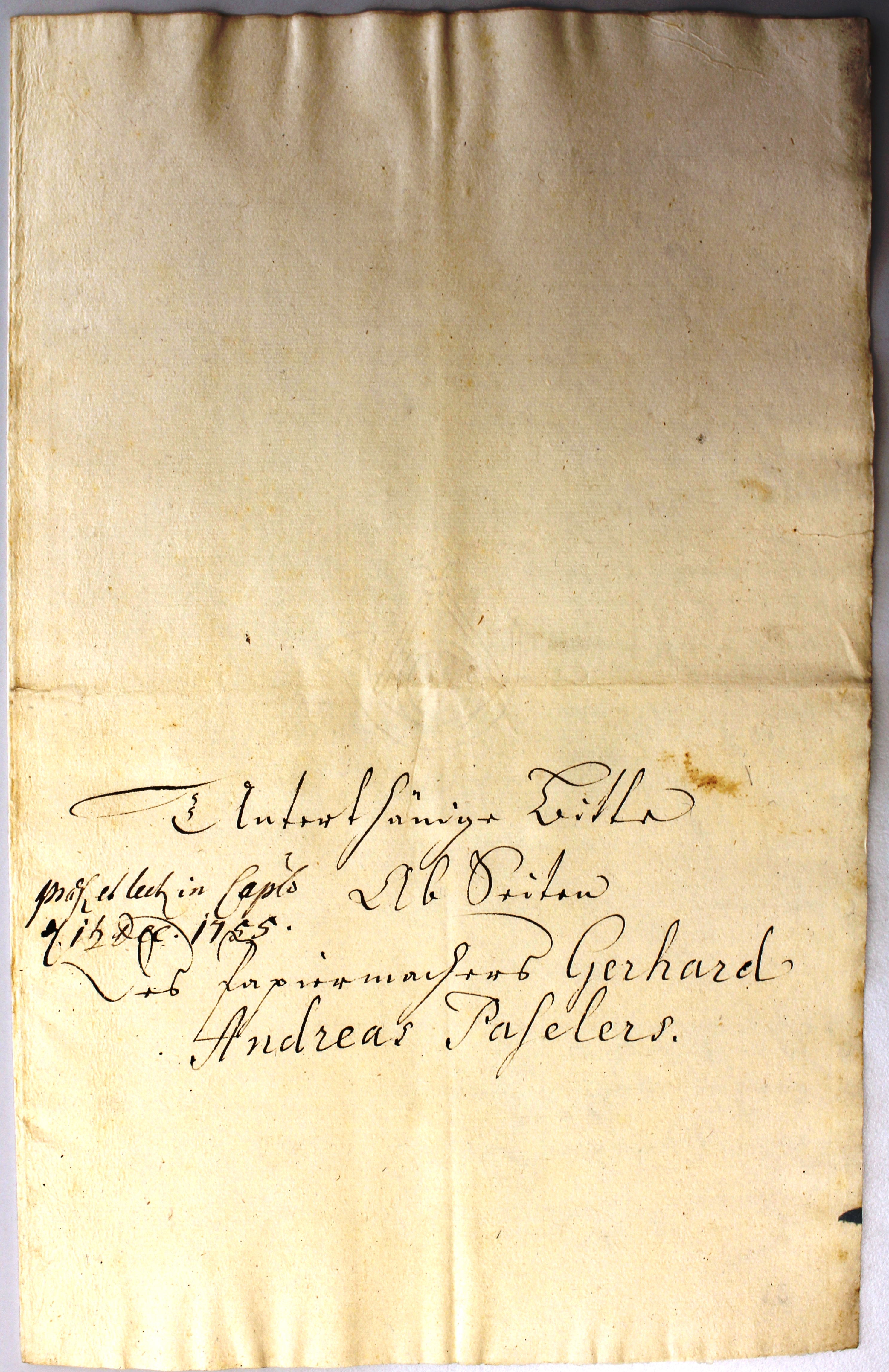 Nötige Vorstellung und Bitte in Schuldsachen des Papiermachers Gerhardt Andreas Paeseler Bekl. (agten) und Liquidaten contra seine in Actis Benahmter samt Creditores Kläger und Liquidanten annehmen, für Hochwürdiges Dom Capitul habe dahero untertänig um weitere Verhaltungs Befehle untertänig nachsuchen sollen; der ich in tiefster Ehrfurcht versterbe