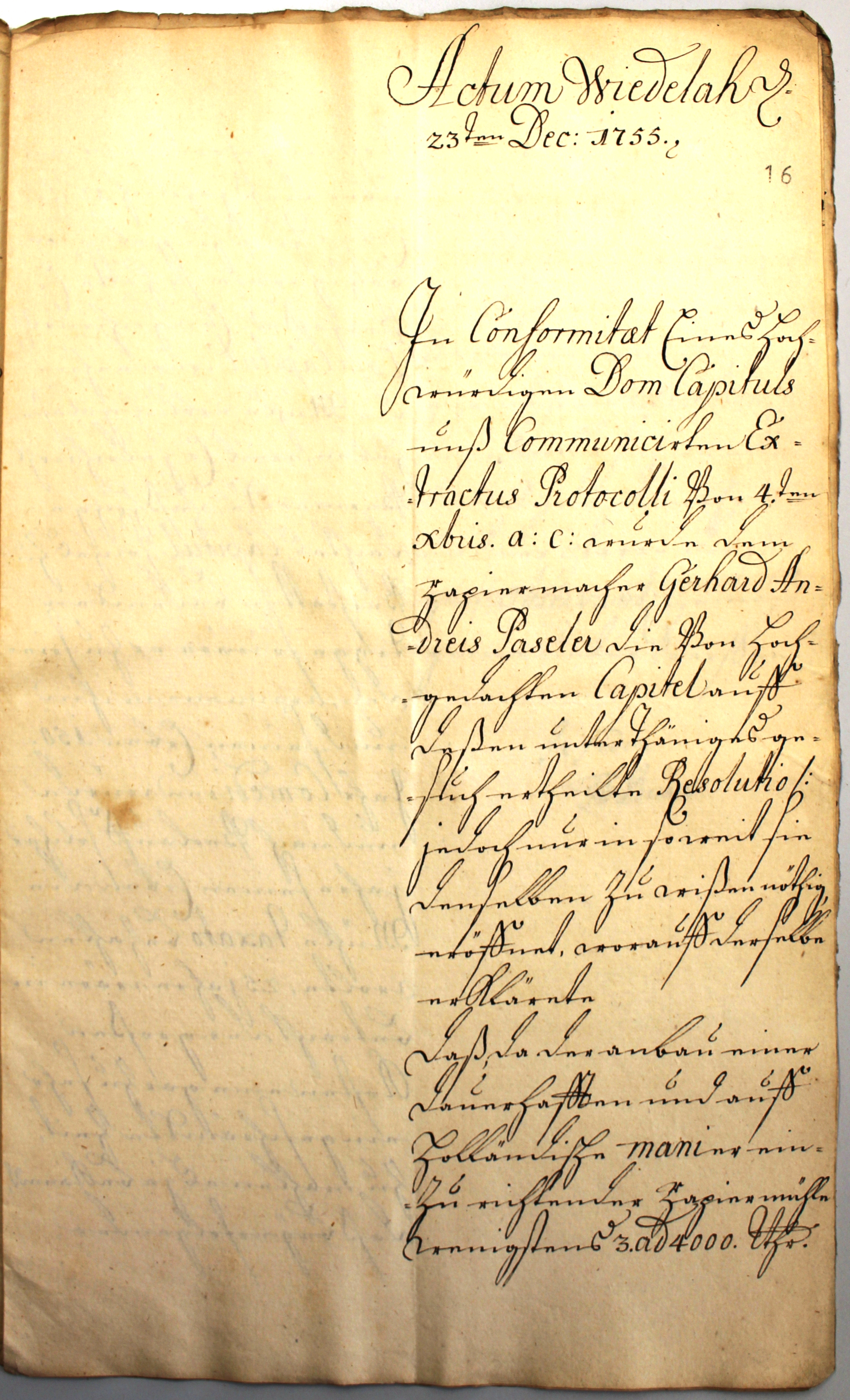 „In Confirmitat eines Hochwürdigen Dom Capituls muss Communicirten Extractus Protocolli vom 4ten x bis. a : c : wurde dem Papiermacher Gerhard Andreas Päseler die von Hochgedachten Capitel auf dessen untertäniges Gesuch erteilte Resolutio /: jedoch nur insoweit sie denselben zu wissen nötig eröffnet, worauf derselbe erklärte, dass der Anbau einer dauerhaften und auf holländische Manier einzurichtender Papiermühle wenigstens 3 ad (bis) 4000 thr (Thaler) Kosten erfordern, er auch über dies jährlich 17 Thr Erben Zins zu geben erbötig wäre, so hätte er verhoffet, ein Hochwürdiges Dom Capitul würde ihm die Mühle gelassen haben, weil er jedoch wohl vermerke, dass Hochgedachtes Capitul solches zu verstalten Bedenken trage, so wäre er zufrieden, wenn man ihm und seinen Erben 150 Jahre Concediren (eine Lizenz geben) würde und nach Verlauf solcher Jahre seinen Erben die Mühle taxato (vollumfänglich) bezahlen wolle. 25 Jahre wären in Betracht der großen Kosten eine gar zu eingeschränkte Zeit, zumal es ja bekannt, dass bei erfolgender Verdienung kaum die Halbschied der auf genannten Kosten in Anschlag gebracht würden, im übrigen verlange er nicht, die geringste exemtion ( (Rechtssprache) rechtsübliche oder gesetzliche generelle Freistellung (besonderer Personenkreise, Institutionen usw.) von bestimmten Lasten und Pflichten oder von der normalen Gerichtsbarkeit ), sondern wolle sich in allem dem Amte, dem Gericht und der Pfarre der hiesigen observants (Regeln) gemäß gerne unterwerfen.