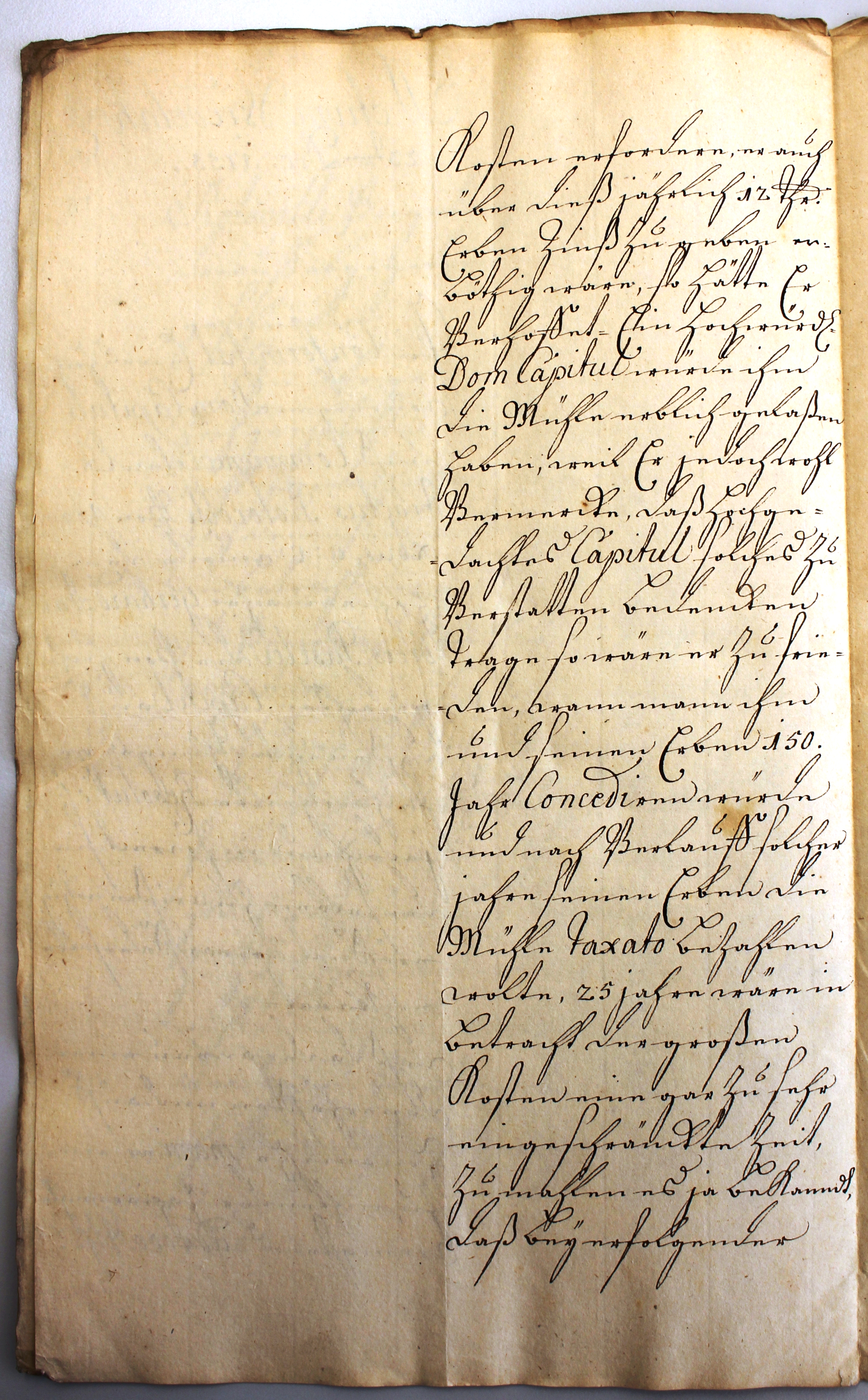 Im übrigen aber mögen wir unseren Hochgeehrtesten und Gnädigen Herren nicht vorenthalten,was maßen die von Hochdenenselben vorgeschlagenen 25 Jahre in Betracht der großen an solchen Bau zu benennen …… Kosten tempus nimis angustum (sehr schmaler Zeitraum) sei,zumalen wenn die Mühle nach verflossenen Jahren einem Hochwürdigen Dom Capitul pro taxato anheim fallen solle, wir müssen aber zugleich gestehen, dass Supplicant (Bittsteller) den Bogen zu hoch spanne, indem er die Concession auf anderthalb Secula (Jahrhunderte ?) ausgedehnt zu werden anverlangt, dahero unsere unvorgewissliche Meinung dahin geht, dass die anverlangte Zeit halbiert und demselben unhefähr 80 bis 90 Jahr verstaltet werden könnte. Der offerierte Erben Zins könnte einschließlich der Lumpensammlung ungefähr auf 15 Tlr erhöht und gesetzt werden.