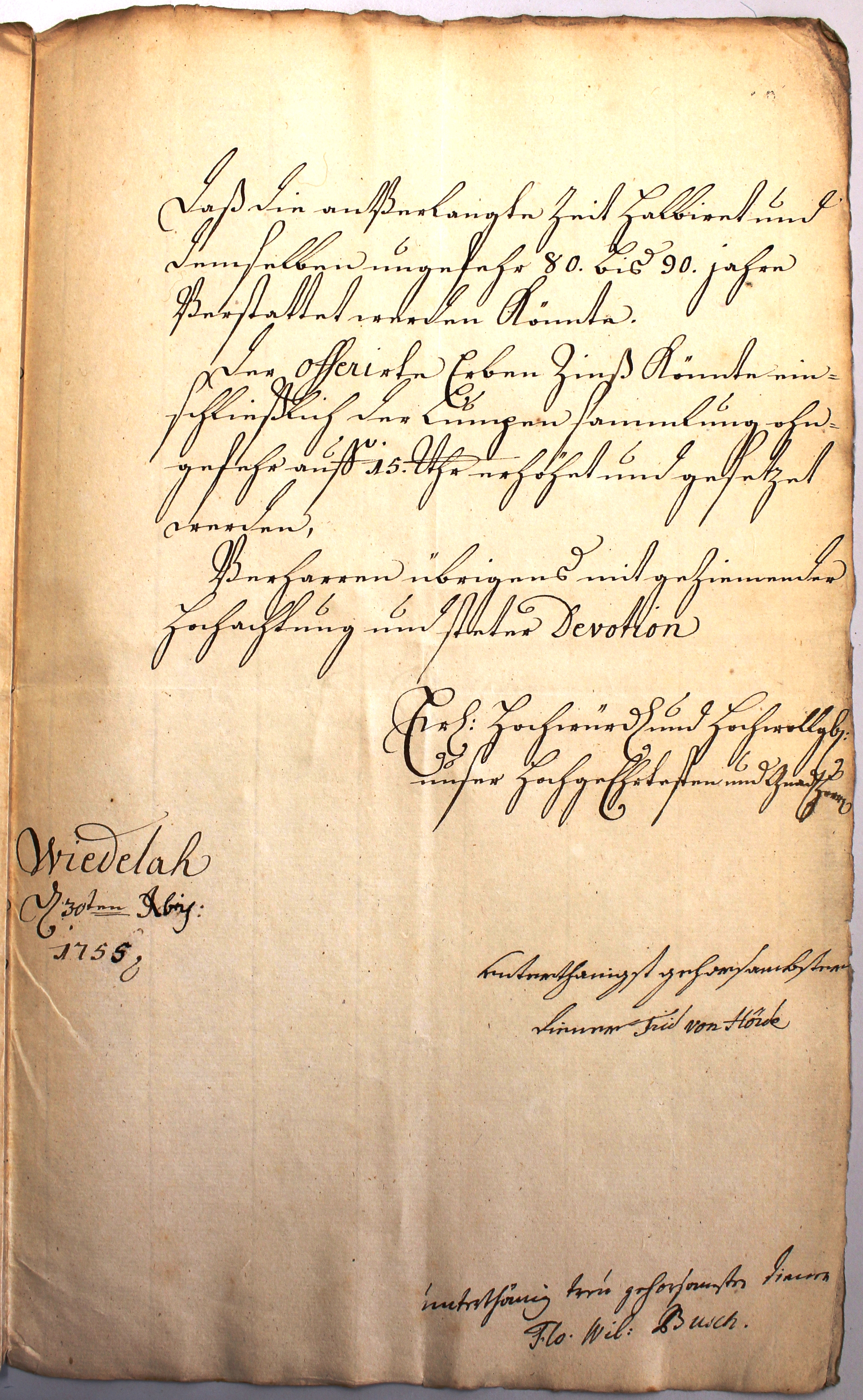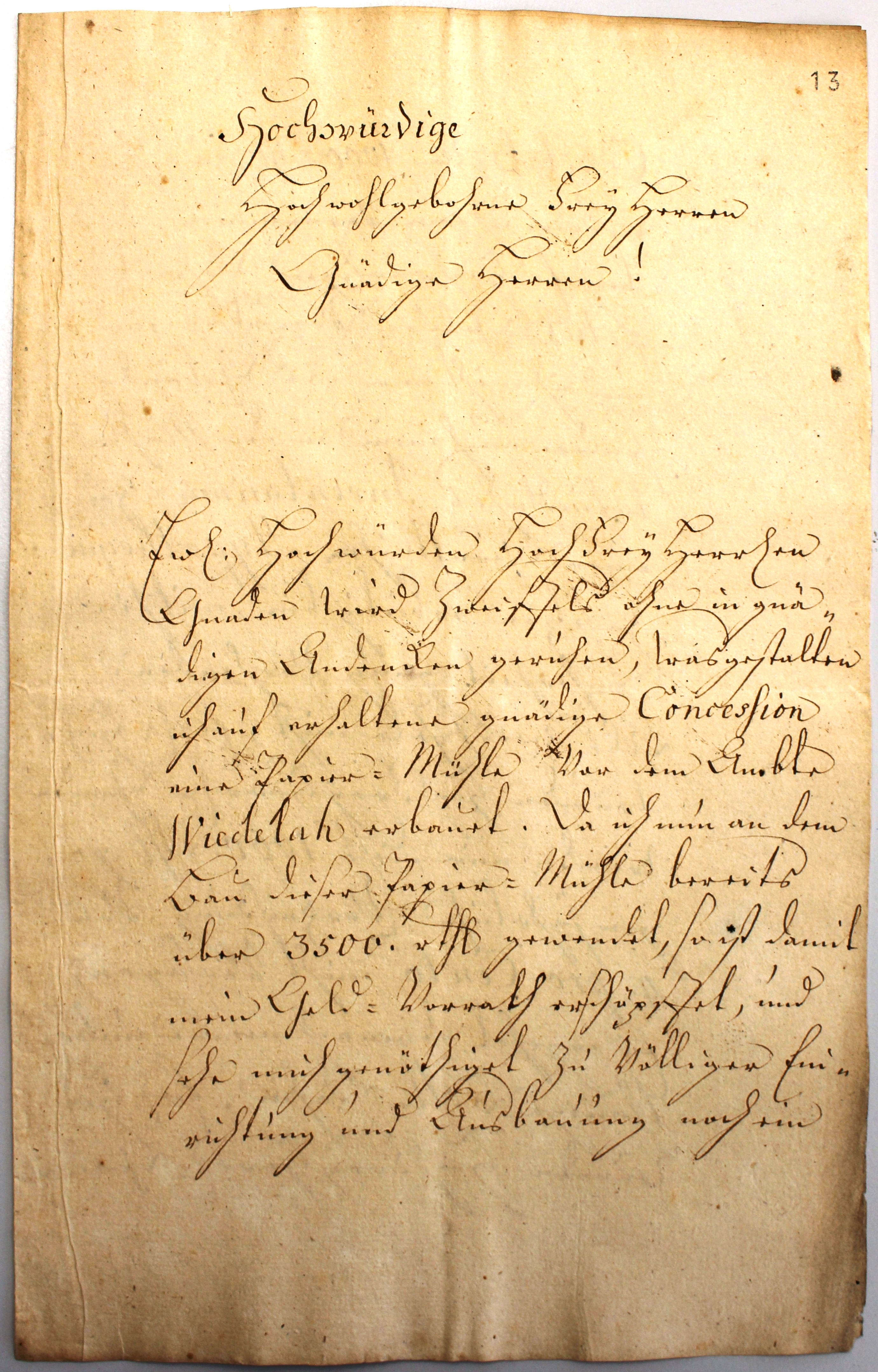Eurer Hochwürden Hochfreiherrschen Gnaden wird Zweifels ohne in gnädigen Andenken geruhen, was gestalten ich auf erhaltene gnädige Concession eine Papiermühle vor dem Ambte Wiedelah erbauet. Da ich nun an dem Bau dieser Papier Mühle bereits über 3500 rthl (Taler ?) gewendet, so ist damit mein Geld = Vorrat erschöpft, und sehe mich genötigt zur völligen Einrichtung und Ausbauung noch ein Capital von 1000 rthl (Taler ?) zu suchen. Wann ich nun vernommen, dass bei Euer Hochwürdigen Dom Capitul Gelder vorrätig sind, und ich nicht nur das Gebäude sondern auch mein in der Mühle befindliches Inventarium zu einer Gerichtlichen Hypotheque zu setzen erbietig bin, mithin Sicherheit genug vorhanden. Als zweifle nicht, Euer Hochwürden Hochfreiherrschen Gnaden werden mir diese 1000 rthl (Taler ?) gegen jährliche Verzinsung von 4 pro Cento nicht versagen. Es ergehet demnach meine untertänige Bitte dahin, Euer Hochwürden Hochfreiherrschen Gnaden wollen gnädig geruhen, und mir diese 1000 (Taler ?) für 4 pro Cento und gegen die offerierte Gerichtl, Hypotheque vorleihen.“.