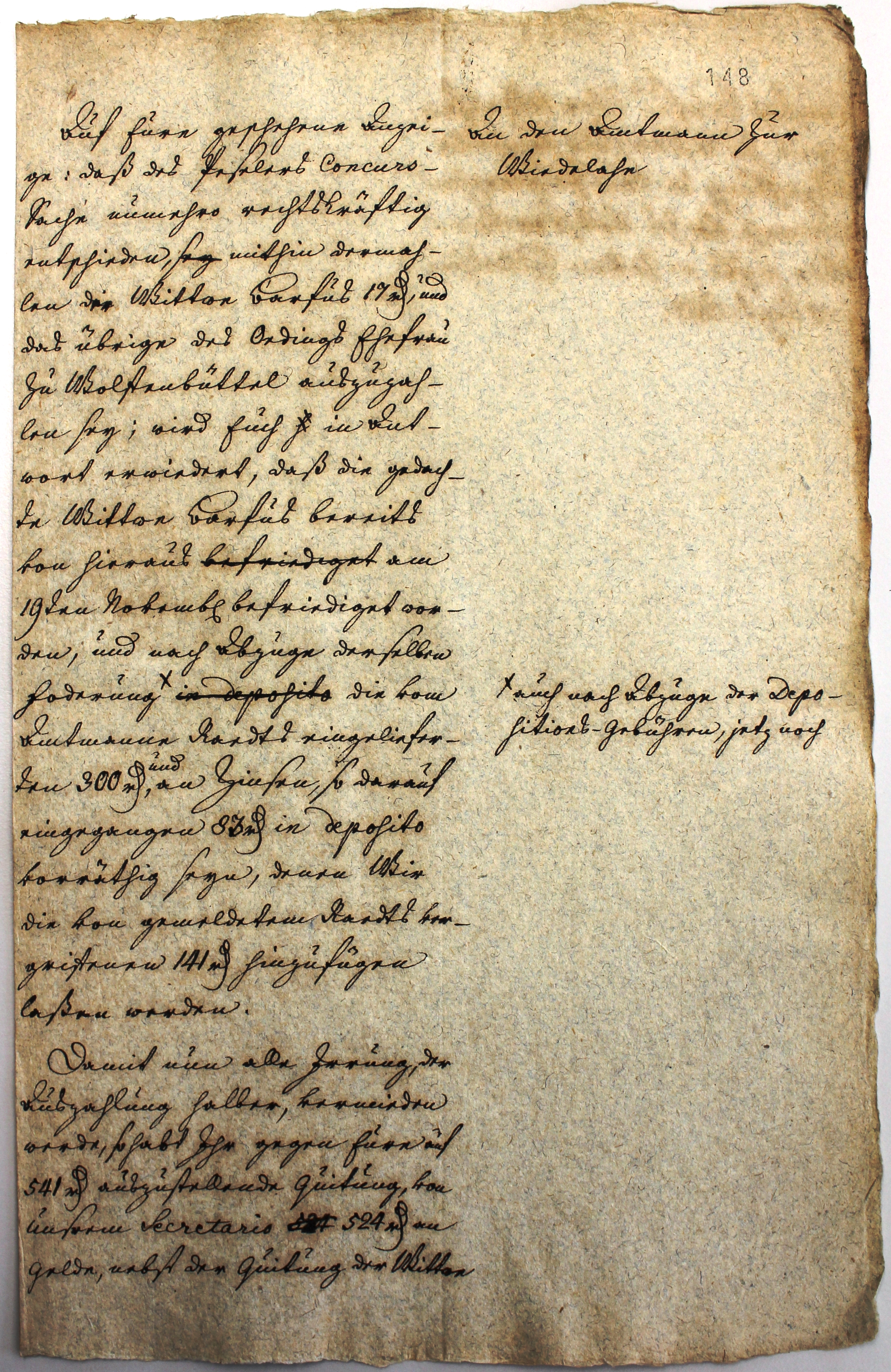 Er wusste aber nicht so genau, was er nun machen sollte. Da die Papiermühle eine Erbenzinsmühle ist und der Bau der Mühle nur unter der Bedingung gestattet wurde, dass diese nach Ablauf von 50 Jahren gegen Erstattung eines Kaufpreises an Hochgedachtem Capitul anheim fallen solle. Er möchte nun wissen, ob die Ew. Hochwürden, Hochwohlgeborenen, Freiherrlichen Gnaden ein gnädiges Belieben trügen, die Papiermühle selbst anzunehmen oder unter welchen Bedingungen sie feilgeboten und verkauft werden solle. Die Kreditoren wurden zum 27. November zwecks Liquidierung der Forderungen vorgeladen.