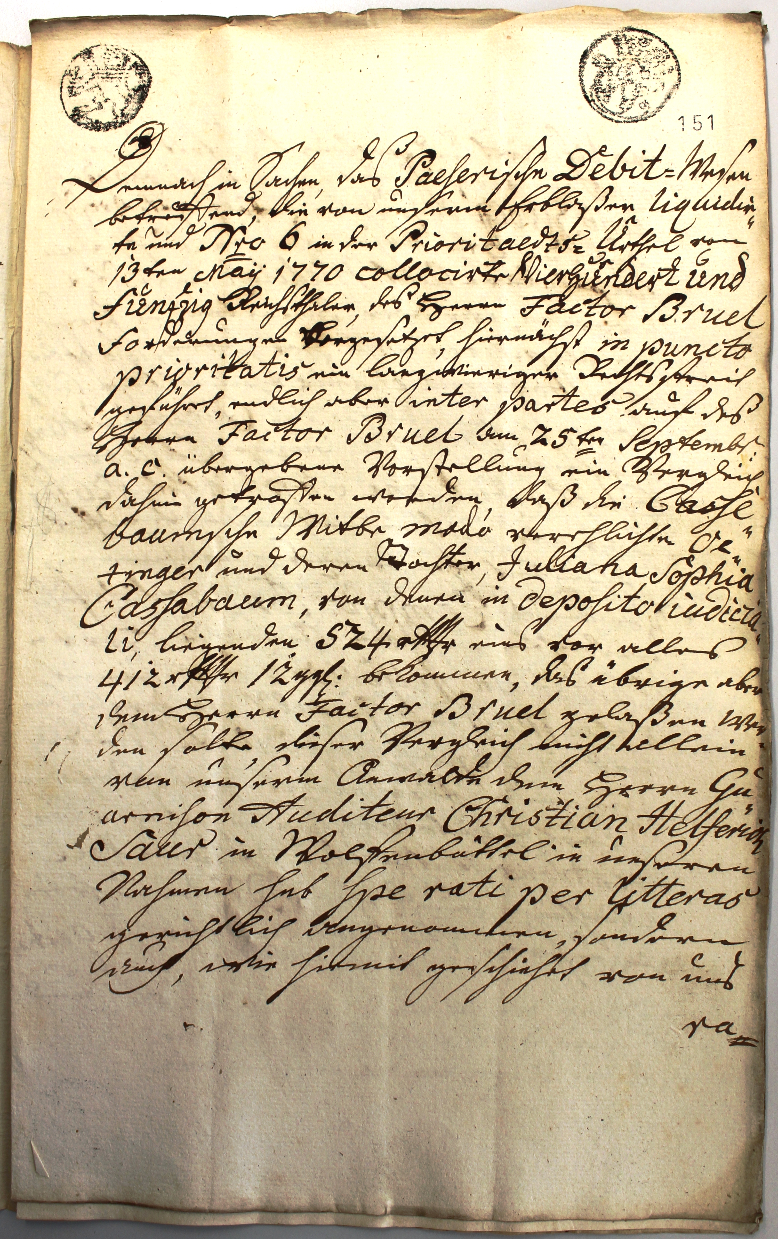 Nun verlangte der Pulverfactor Briel , dass ein zügiges Prioritätsurteil gefällt werden soll, worin festgelegt wird, welcher Gläubiger zuerst von dem Konkursgeld befriedigt wird. Er beschwerte sich noch einmal darüber, dass durch die Verzögerungstaktik und nicht eingehaltene Versprechungen des Wiedelaher Amtmannes Raedts das Verfahren fünf Jahre gedauert hat. Auf Grund der Justizverweigerung, der vielen Verzögerungen und seinen vielen unnötigen Kosten möchte das Dom-Capitul ihm den Vorzug vor allen anderen Gläubigern geben. Er fleht die Hochwürdigen Hoch- und Hochwohlgeborenen Gnaden untertänigst an, ein Anweisung abzufassen und dem Amt Wiedelah aufzugeben, das Prioritäts-Urteil unverzüglich zu publizieren und selbiges auf das Schleunigste zu einer Endschaft zu bringen.