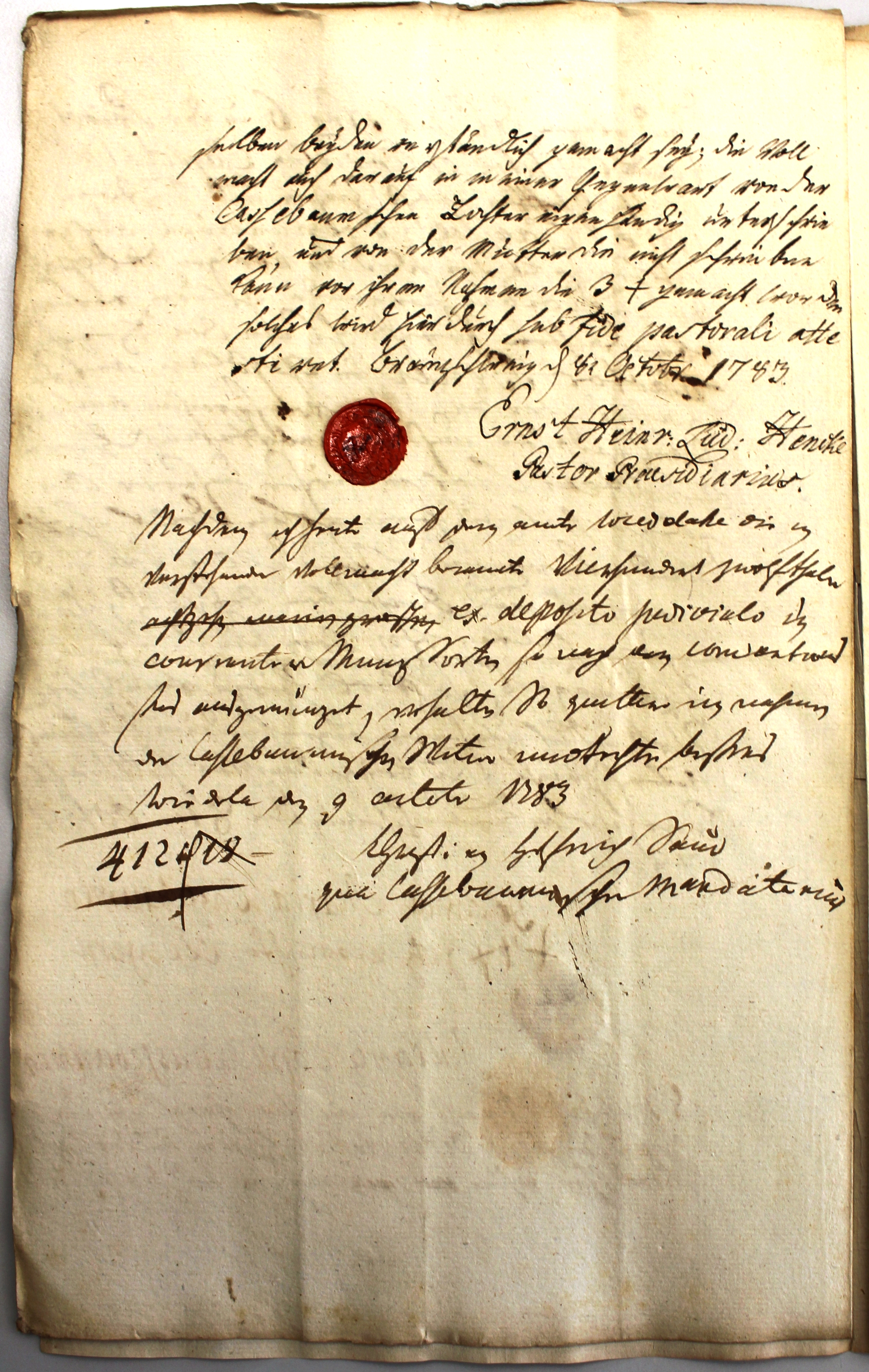 Verharren übrigens mit geziemender Hochachtung und steter Devotion (Untertänigkeit) Euer Hochwürd und Hochwohlgb., unsere Hochgeehrtesten und Gnäd. Herren untertänigst gehorsamsten Diener Frid von Hönk