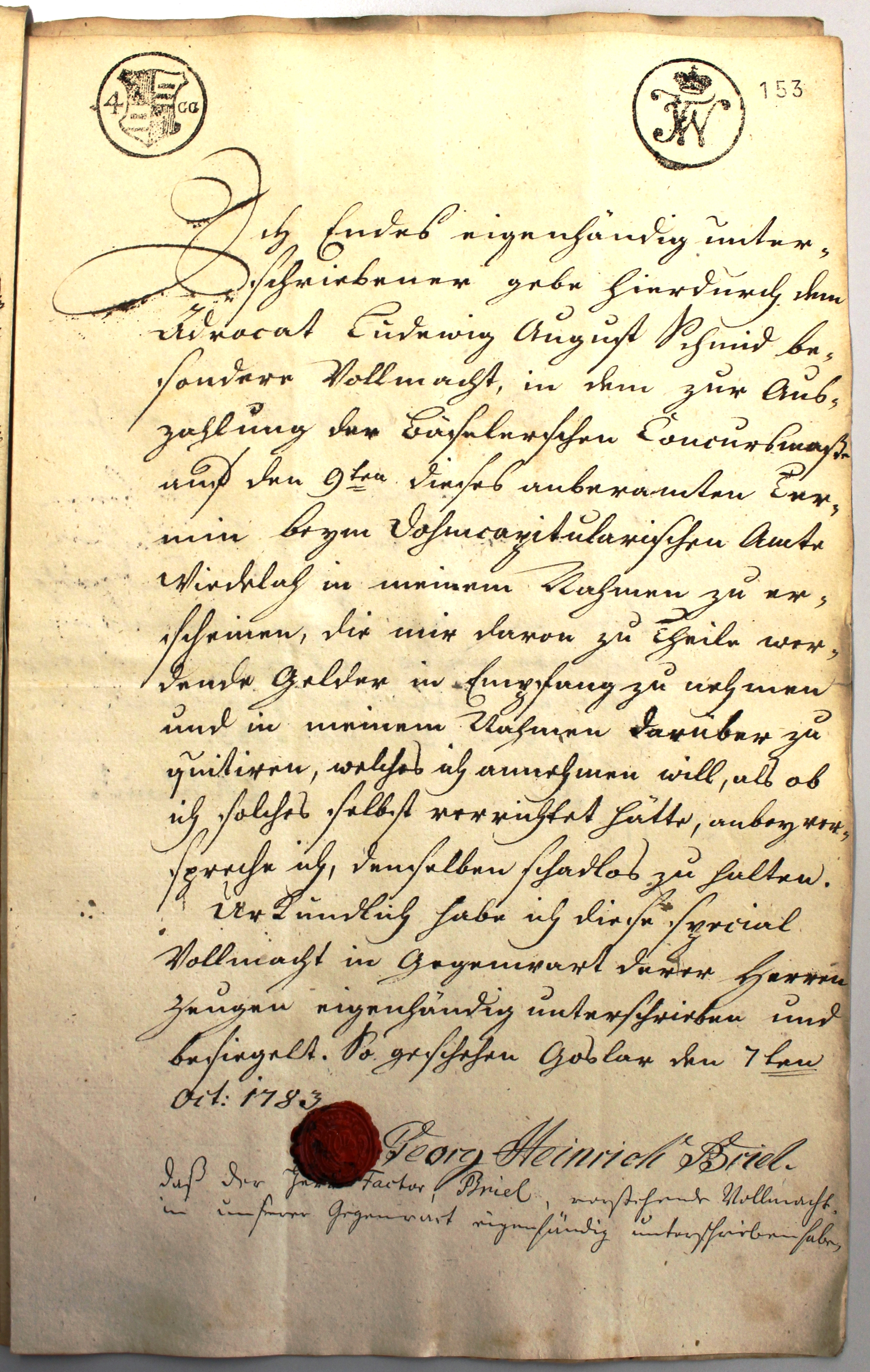 So mache ich für mich, meinen Erben und Erbnehmern mich hiermit Sub hypotheca bonorum (unter guter Hypothek) anheischig, und reservire mich (sich schriftlich verpflichten), nicht alleinsolche neu anzulegende Paqpier-Mühle aus der Ecker gut und dauerhaft auf meine eigene Kosten zu erbauen, sondern auch die mir gnädig verwilligte erste Fünfzig Jahr lang, alljährlich und jedes Jahr besonders Fünfzehn Reichs Taler für solche Jahr Concession zur zur recognition (Anerkennung) ohnweigerlich zu erlegen und zu bezahle, auch mir gefallen zu lassen, dass nach vollzogenem Bau, ob die Mühle gut und dauerhaft angelegt sei, per peritos in arte (per Fachmann), bestimmt und aestimirent (beurteilt) werden möge und wann nach Ablauf derer Fünfzig Jahren mit Hochwürdigen Dohm-Capitul wegen des angmenti (Wachstum) der ferner zu entrichtenden jährlichen recognition (Anerkennung) , ich oder meine Erben sich nicht würden vereinbaren können, selbige als dann die Mühle und dazugehörige Gebäude, nach Bezahlung dessen, wofür solche sodann nach Ablauf obbemerkter stipulirter Jahre auf behörige Art wird aestimirnt (bestimmt) werden, hinwieder völlig zu …innen (?) schuldig sein sollen, und Reverendissimum et Illustrissimum Capitulum Cathedrale die Mühle darauf an andere zu verpachten, freie Macht habe, gleichwohl dass mir oder meinen Erben, wenn diese das nämliche Pacht Quantum wozu ein tertius (Drittel) sich verstehen möge, ebenfalls zu geben, sich verbieten würden, der Verzug für andere solchenfalls gestattet werde, wozu auch noch verspreche, dass die auf solcher Papier-Mühle vorfallende Taufe-, Copulations- (kirchliche Trauung) und Begräbnis-Actus jedesmalen durch den römisch-catholischen Herrn Pastor zu Wiedelah verrichten, wie auch das nötige Bier und Brandtwein, von Hochgedachtem Dohm-Capitularischen Amte nehmen und holen lassen wollen. Ich gebe auch für mich und meine Erben mich wohlbedächtlich aller gegen diesen Revers (Verpflichtungserklärung) zu machende Einreden und Ausflüchte, sowohl überhaupt als ins besondere derer Exceptionen (Ausnahmen) einer Übereilung, Überredung, Verletzung, es sei dieses alles anders als abgeredet, als hier niedergeschrieben, oder etwas Simulirtes darunter vorhanden, der Wiedereinsetzung in vorigen Stand und der Rechts-Regul, dass eine allgemeine Verzicht nicht von Kräften, wenn nicht eine besondere vorhergegangen, als dass mir nichts dann die wörtliche Erfüllung dieses Reverses (Verpflichtungserklärung) zu fallen kommen soll. Alles getreulich sonder Arglist und Gefährde. Urkundlich dessen habe diesen Revers (Verpflichtungserklärung) eigenhändig unterschrieben und mein Pettschaft (Siegel) daneben gedrucket.