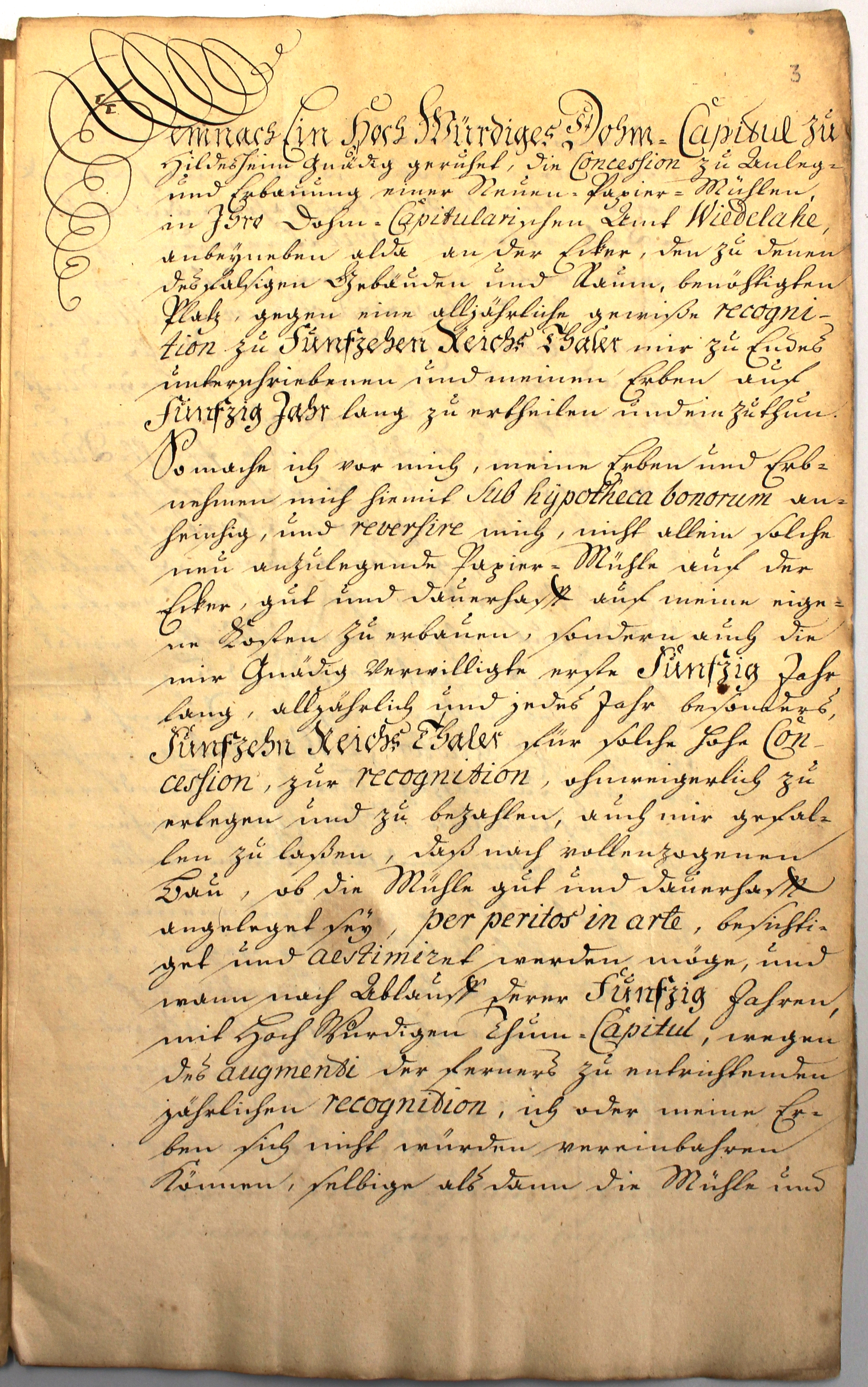 „Demnaes ein Hoch Würdiges Dohm-Capitul zu Hildesheim gnädig geruhet die Concession zu Anleg – und Erbauung einer neuen Papier-Mühle in Ihro Dohm-Capitularischen Amt Wiedelahe anbei neben, alda an der Ecker, den zu denen …. Gebäuden und Raum benötigten Platz gegen eine alljährliche gewisse recognition (Anerkennung) zu Fünfzehn Reichstaler mir zu Endes unterschriebenen und meinen Erben auf Fünfzig Jahr lang zu erteilen und ein zutun.