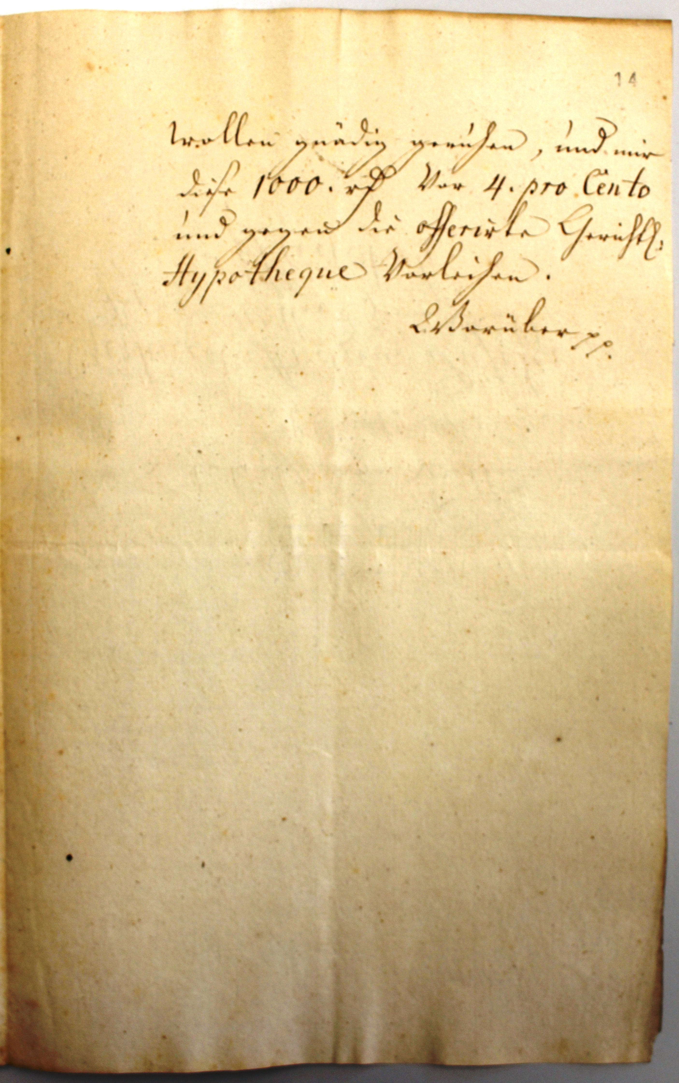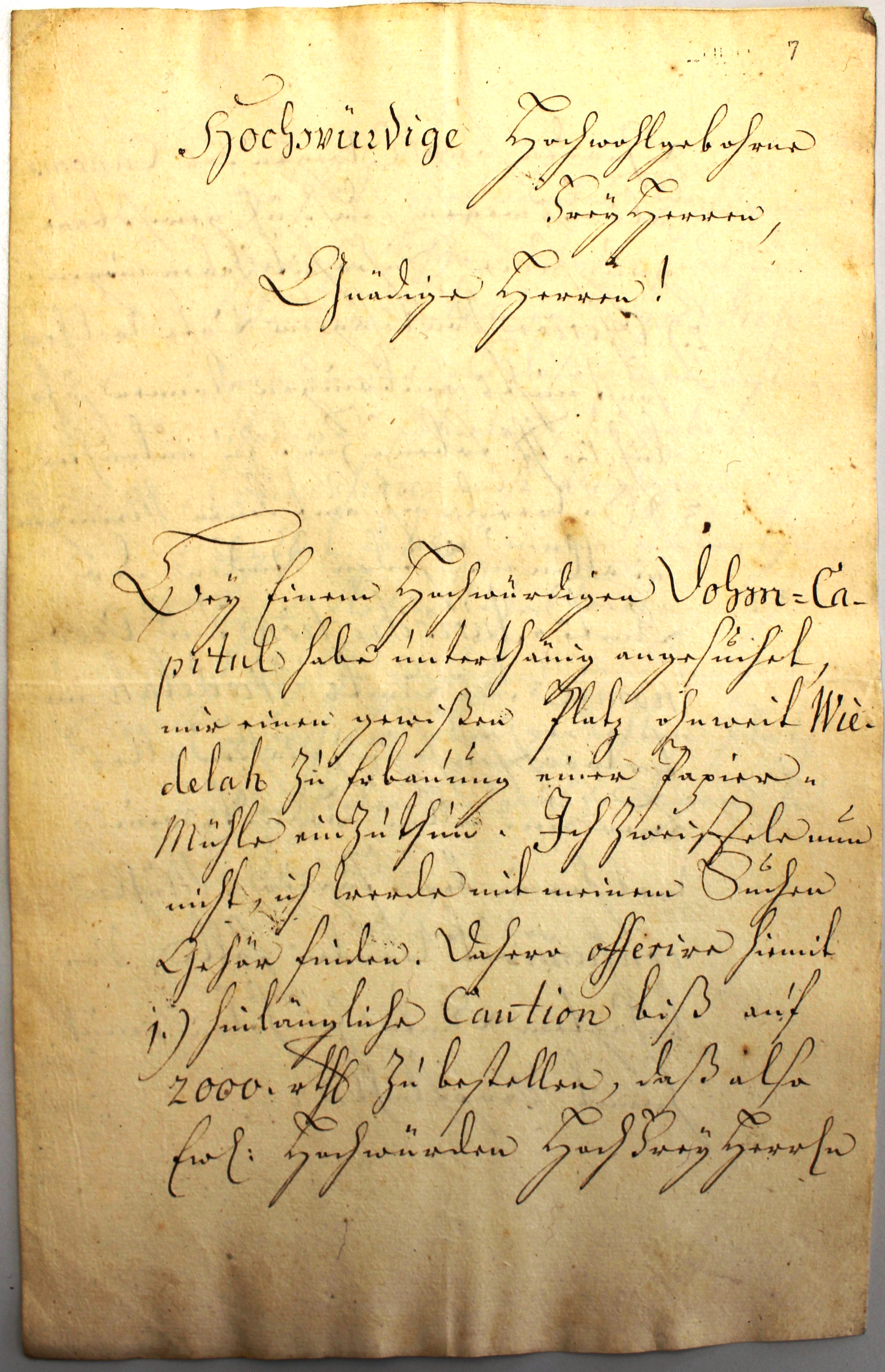 1.) hinlängliche Caution bis auf 2000 thr (Thaler ?) zu bestellen, dass also Eure Hochwürden, Hochfreiherren Gnaden sowohl wegen des Canonis ab deswegen, dass ich gewiß keine genügsame Sicherheit haben mögen.