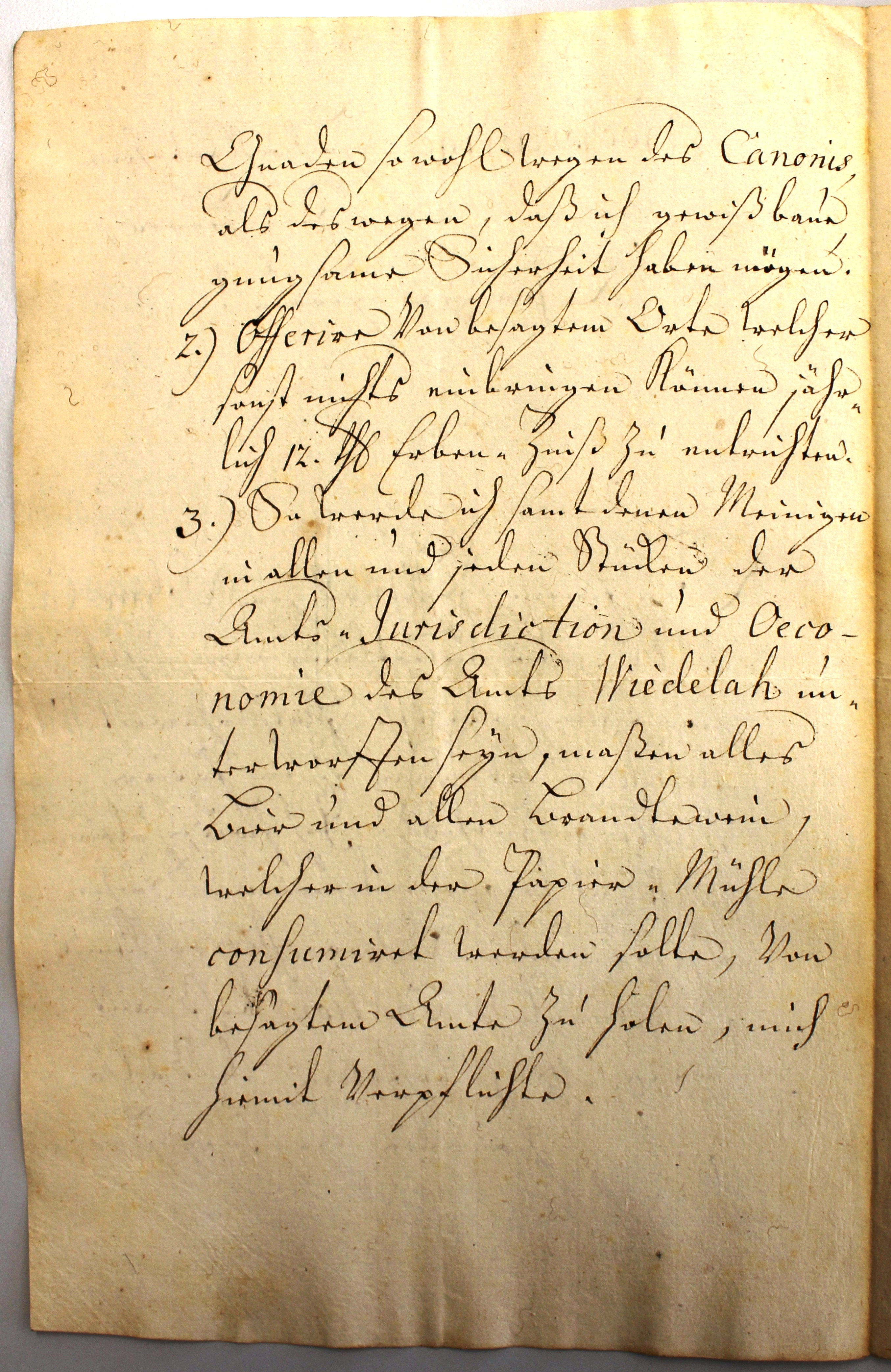 3.) So werde ich samt denen Meinigen in allen und jeden Stücken der Amts Jurisdiction (Gerichtsbarkeit) und Oeconomie des Amts Wiedelah unterworfen sein, maßen alles Bier und allen Brandtewein, welcher in der Papier Mühle consumiert werden sollte, von besagtem Amte zu holen, mich hiermit verpflichte.