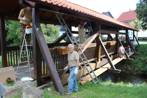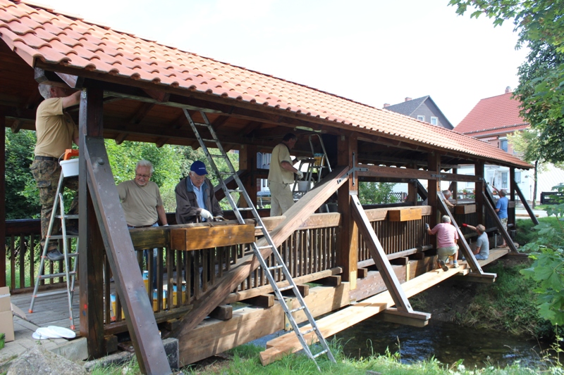 Vor dem Neuanstrich wurde die Brücke gereinigt, um Staub, Spinnweben und Farbschmierereien zu entfernen. Beim Anstrich des Holzes hat man dann gemerkt, dass die Brücke schon lange keine Farbe mehr bekommen hat, denn das Holz hat sie sehr schnell aufgesogen. Der Wettergott hat uns auch beschützt, sodass uns der eine Regenschauer nichts mehr anhaben konnte, denn in dieser Zeit waren wir schon mit dem Innenanstrich beschäftigt. Insgesamt wurde das Holz zweimal gestrichen. Um 09:00 Uhr haben wir begonnen und um 14:00 Uhr war diese Arbeit erledigt. Die Kosten für Farbe, Pinsel, Schleifpapier und Abdeckfolie für die Eckerbücke hat die Stadt Goslar übernommen.